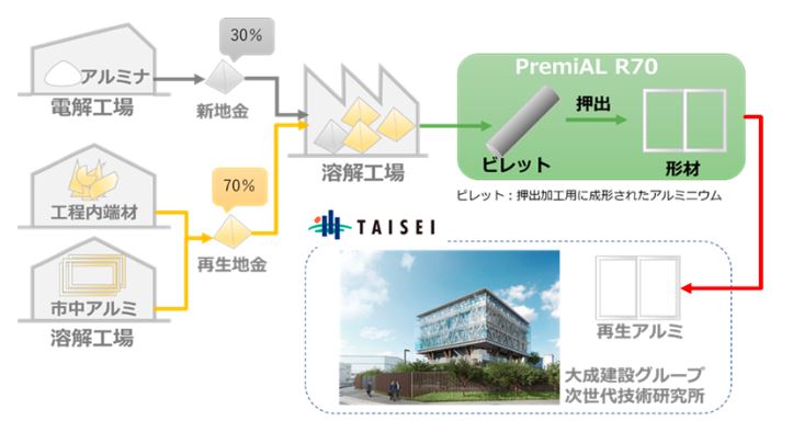 LIXIL Corporation (hereinafter referred to as LIXIL) is pleased to announce that it has been selected to supply its recycled low-carbon aluminum profiles "PremiAL R70," which use 70% recycled aluminum as raw material, for the first time in Japan as building materials for the research management building of the Taisei Corporation Group's Next Generation Technology Research Institute (located in Satte City, Saitama Prefecture, hereinafter referred to as the Next Generation Technology Research Institute, see Figure 1). The adoption of "PremiAL R70" will contribute to the realization of "Zero Carbon Buildings," which achieve virtually zero CO2 emissions throughout the entire building lifecycle, including procurement, construction, and operation stages.